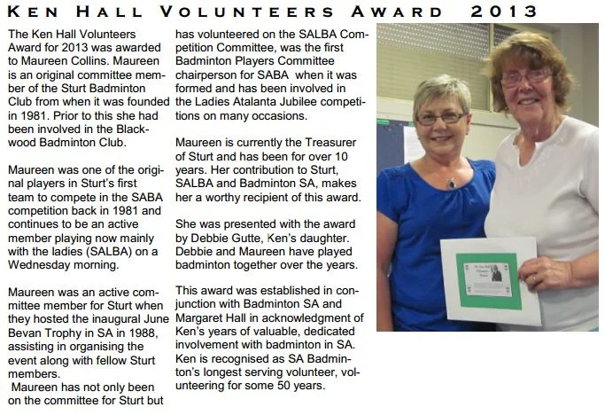 In 2013 Maureen Collins, Treasurer of Sturt Badminton Club, was presented with this award as was Pauline Arthur, Secretary of Sturt Badminton Club, in 2011 (see further down for more info).