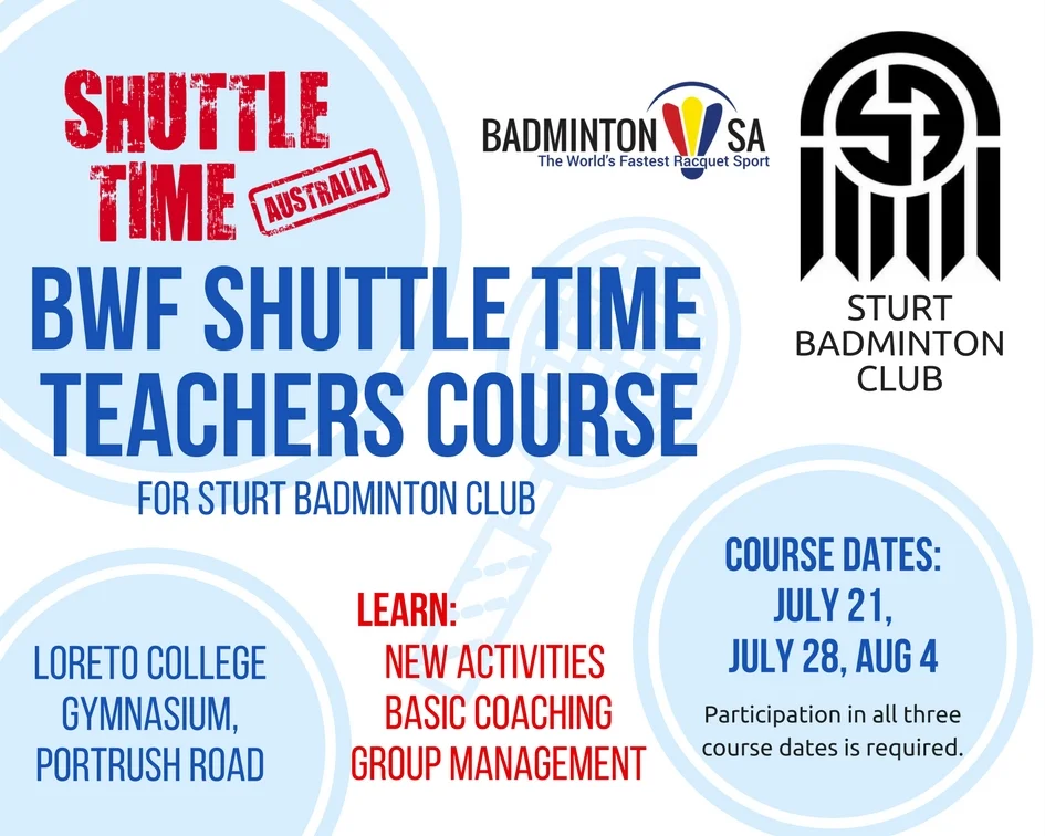 Badminton SA will be providing a Shuttletime course on the 22nd of September at 9:00am at WA Satterley Hall, Lockleys.